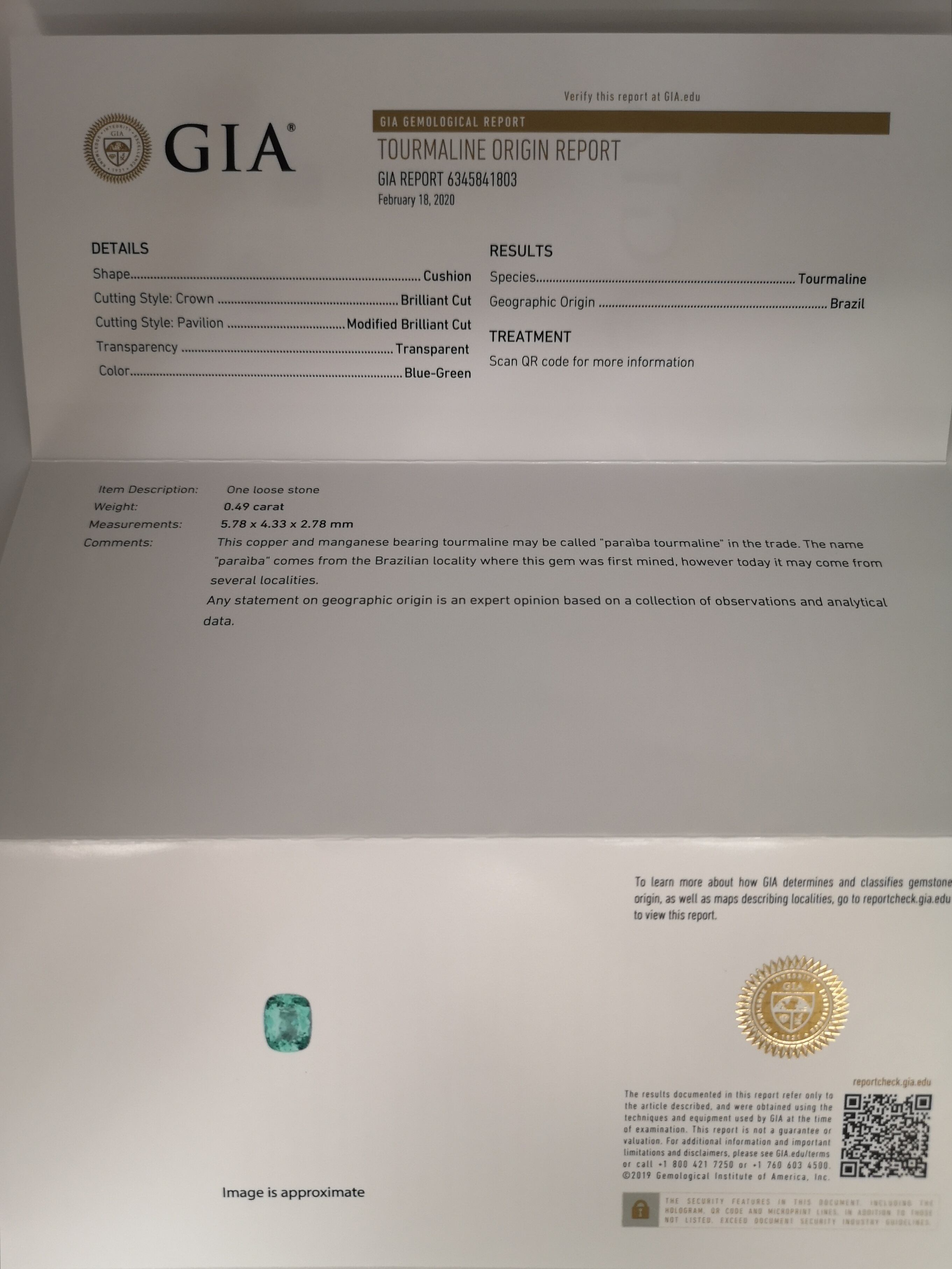 縦5.78×横×4.33×厚み2.78 mm と石のサイズが記載されております。