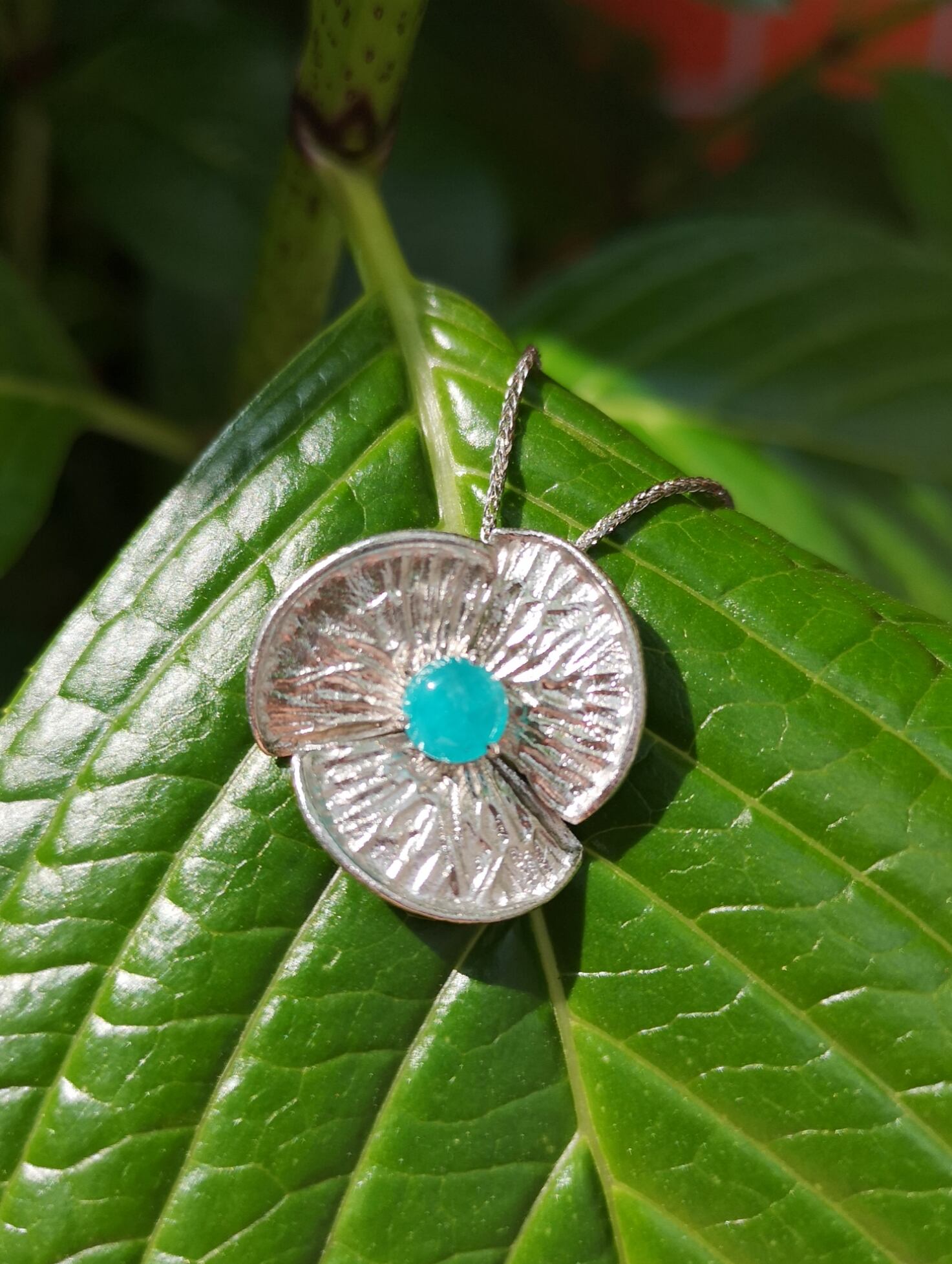 カボションカットのお色も濃いネオンブルーのパライバトルマリンとプラチナのお花をあしらったシンプルで贅沢なネックレスです。