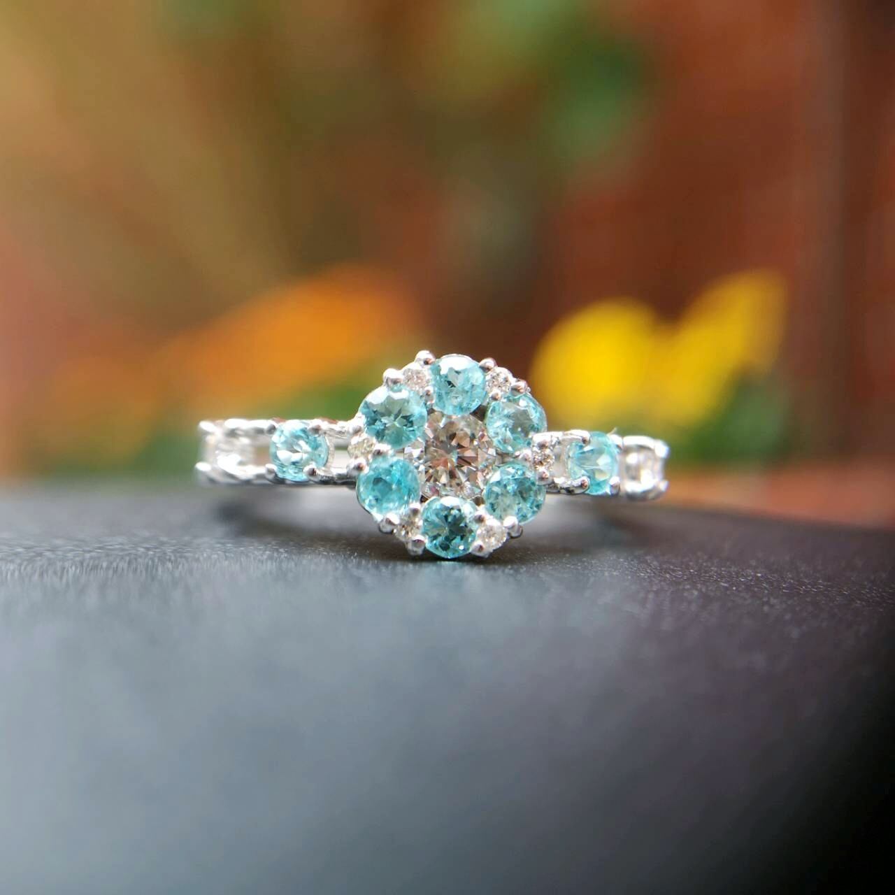 ネオンカラーの色の均整が整ったパライバトルマリンが華のようのにちりばめられて優しく繊細なデザインで中央にも綺麗にダイヤモンドが輝いております。中心部分の下側にもダイヤモンドがアクセントに留まっております。