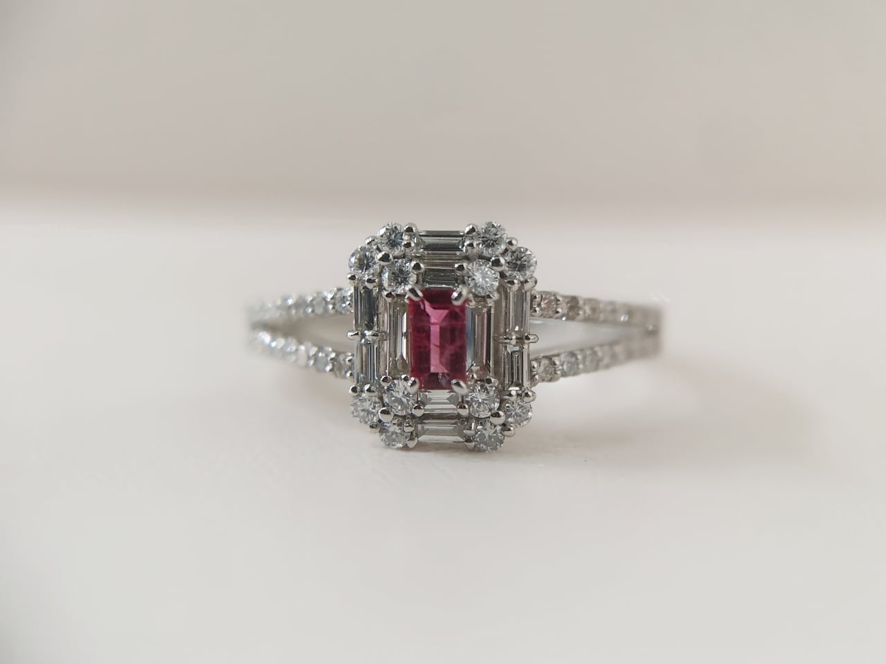 デザインは、レッドベリルを美しく見せるスッキリとした印象のバケットダイヤを使用し、アクセント使いのメレダイヤで可憐かつ華やかさもプラスされ主役のレッドベリルを一層引き立たせてくれます。