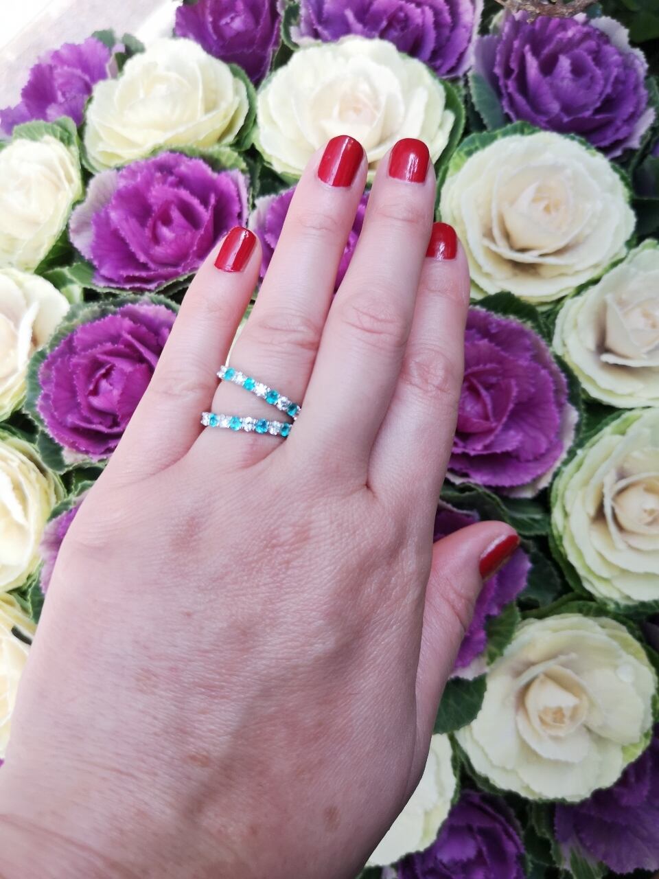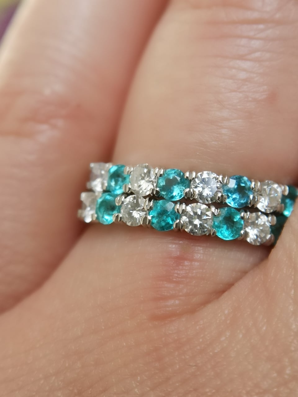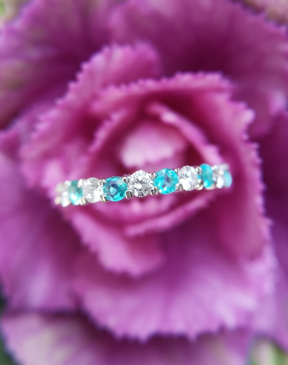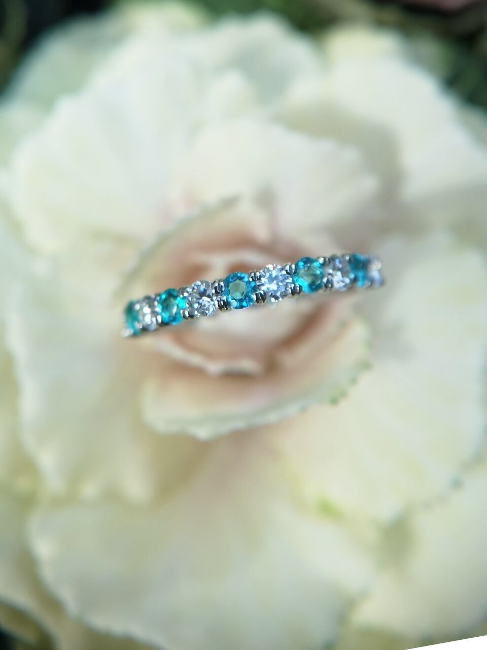 美しいネオンカラーの、しかも貴重なメレサイズのパライバトルマリンが入荷しましたので、クオリティーの良い上質のダイヤモンドを交互に留め贅沢なハーフエタニティーにお仕立てしました。