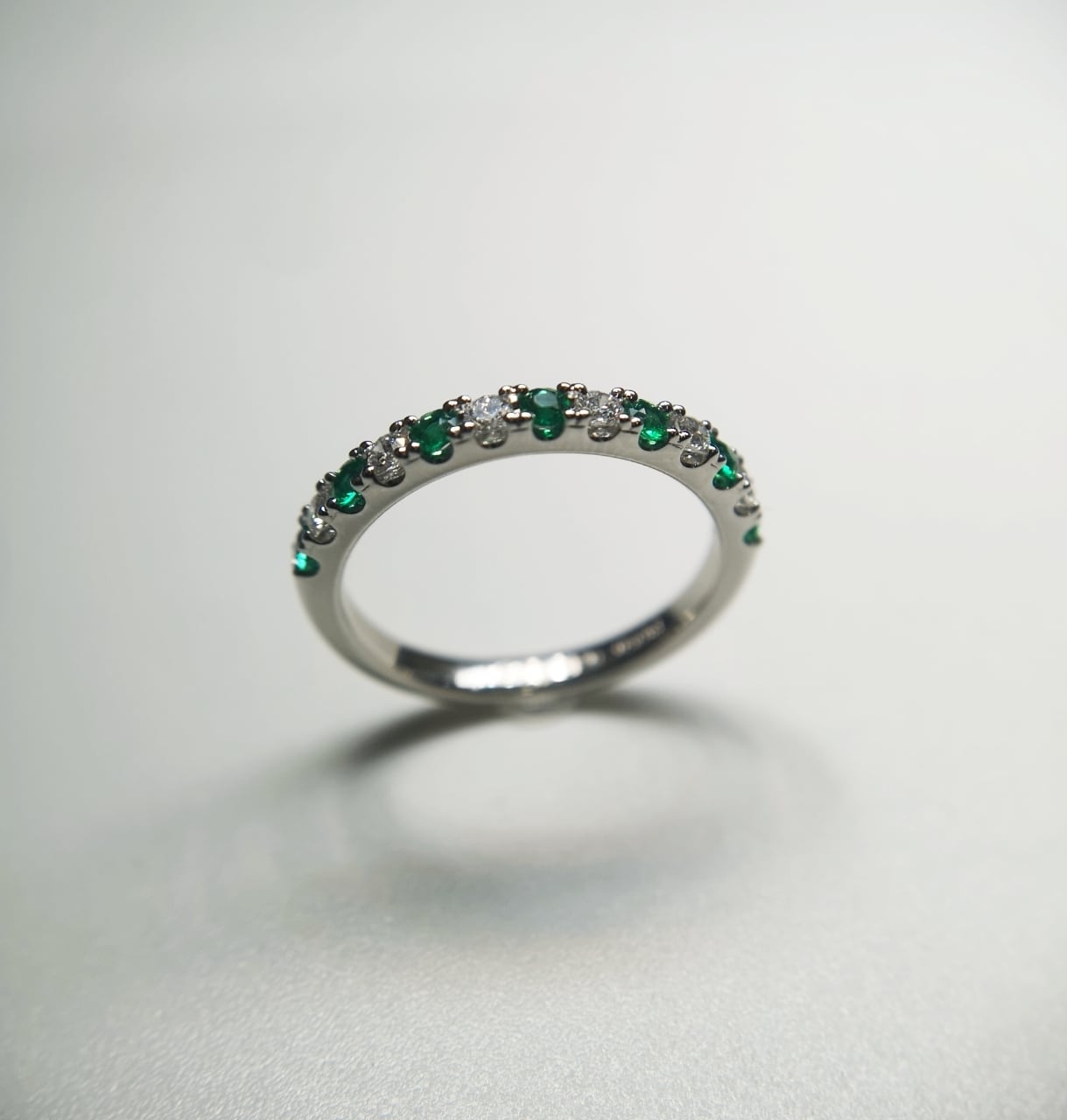 色が揃って高品質な透明感のあるコロンビア産エメラルドと、綺麗なダイヤモンドのエタニティーリングのご紹介です。